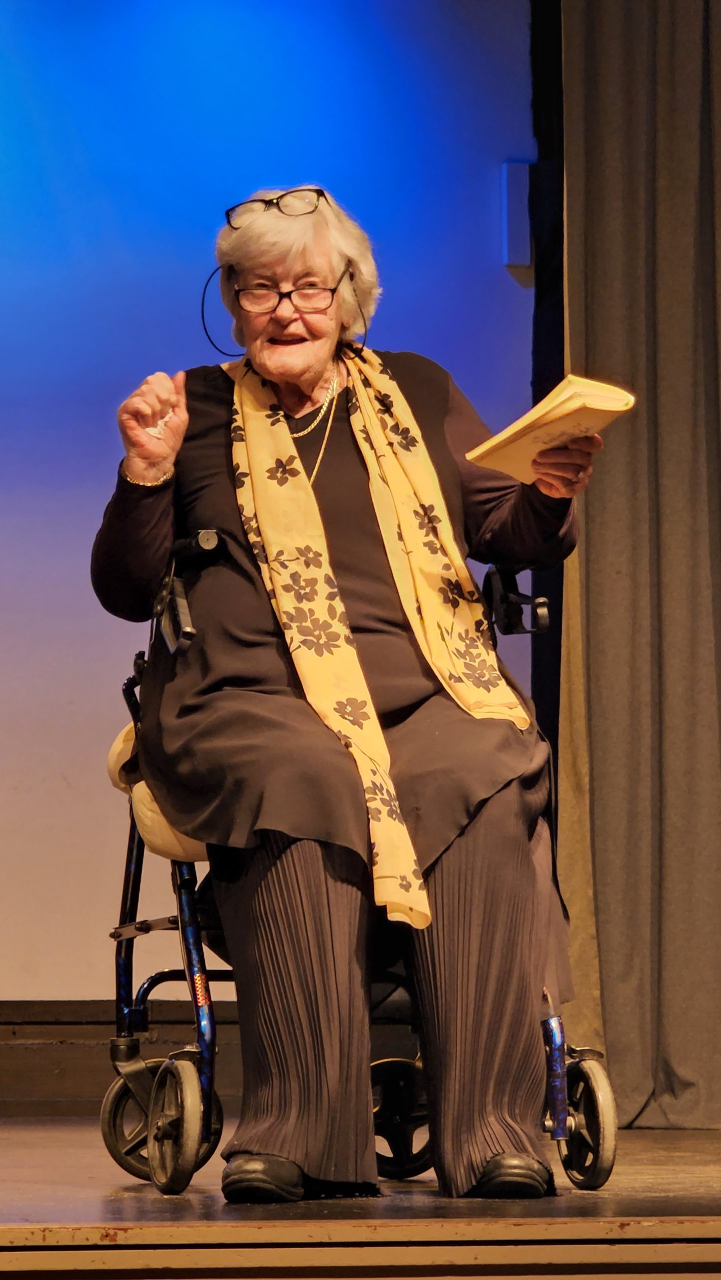 Club Night wasn’t Club Night without one of her monologues from Joyce Grenfell or Victoria Wood (No, don’t do that Sidney, it isn’t nice!), and for years she was co-director and/or prompt for our July School-holiday children’s plays. I was privileged to co-direct The Great Piratical Treasure Hunt with her in 2023, and she was a joy to work with, her wealth of knowledge and personal culture palpable, her joy in life and real interest in every person she met standing out. We had a tradition of accepting all children who turned up to the audition – it was usually about a dozen – but when 35 turned up that year, Jill couldn’t bear to turn any away, so we had a very full cast and lots of work for Wardrobe!!